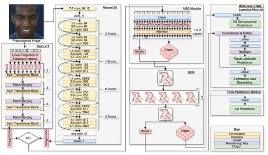 Analysis of base learners’ architectural selections. The AUs on the left correspond to both base learners for that AU, as we required both to have the same architecture. Pretrain refers to using pretraining (✓) or not (X). SynAU refers to the use of our SynAU dataset (✓) or not (X). Swin refers to using the Swin Transformer (✓) or the Resnet architecture (X). AGG-3 refers to using three layers (✓) or one layer (X). COAL refers to using the COAL module during training (✓) or not (X). The COAL module is not available for base learners that use the SynAU (—), as it does not provide landmarks.