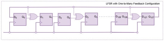 To maximize hardware efficiency and reduce latency, a one-to-many feedback configuration is employed, in which a single feedback bit is distributed to multiple tap positions. This configuration allows the logic to be implemented in just two levels, minimizing critical path delay compared to conventional many-to-one feedback designs. It is particularly advantageous for high-throughput or resource-constrained environments. An illustration of this structure is shown in Figure 1.