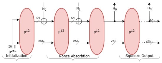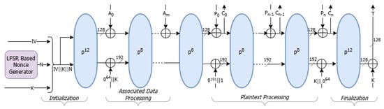 A twelve-round permutation, , is first applied to the concatenated input , ensuring strong diffusion and secure mixing of the key and nonce. During the associated data absorption phase, each associated data block is XORed into the rate portion of the state, followed by an eight-round permutation, , after each block.