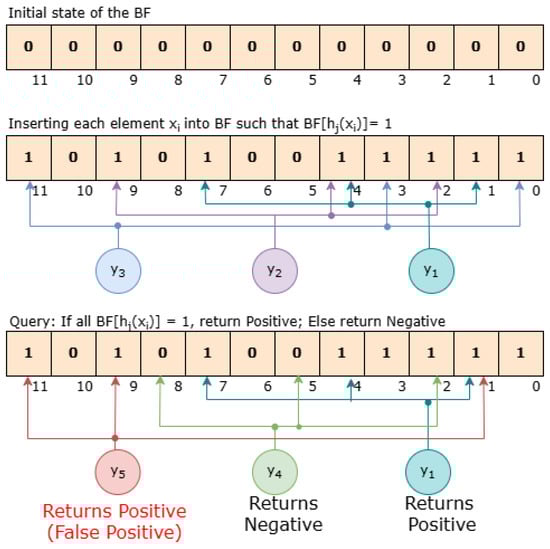 Let be a subset of a universal set U, containing n elements. A Bloom Filter represents these elements using a bit vector of length m, with all bits initially set to zero. To include an element x in S, k distinct hash functions, , are used to assign x to k specific positions within the bit vector, where each falls within the range [0, m − 1]. The bits at these positions in the vector are then set to 1. To check if a given element is part of set S, the element is hashed to the bit vector using the same k hash functions, and the bits at the corresponding positions are examined. If any of these bits is 0, the Bloom Filter determines that the element is not part of S; if all are 1s, the Bloom Filter suggests that the element might be in S. However, it guarantees no false negatives, meaning any element reported as “not present” is definitely not in the set. Figure 4 shows an example of a Bloom Filter with filter size, bits, and hash functions, , used to represent a set . The 12-bit vector is initialized to all zeros. Upon inserting elements, specific bits corresponding to each element are set to 1, as determined by the hash functions.