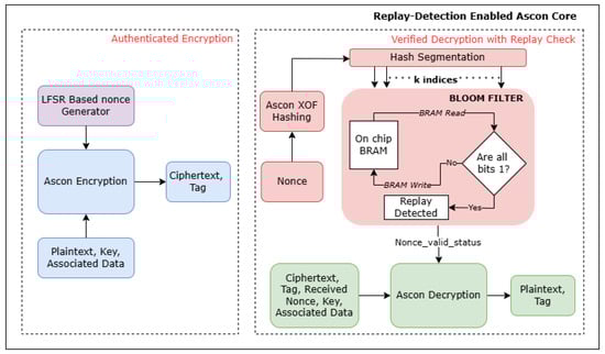 A core design objective is to integrate replay detection into the Ascon framework without introducing significant hardware or timing overhead. Rather than introducing an independent hashing function for the Bloom Filter indexing, this design utilizes the existing AEAD permutation logic to implement Ascon-XOF128 hash, thereby minimizing design overhead. The system workflow consists of three primary stages: Ascon encryption, replay attack detection using Bloom Filter driven by Ascon-XOF128 hashing, and Ascon decryption, as illustrated in Figure 6.