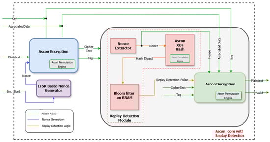 Block diagram of the enhanced Ascon core integrating LFSR-based nonce generation and replay detection.