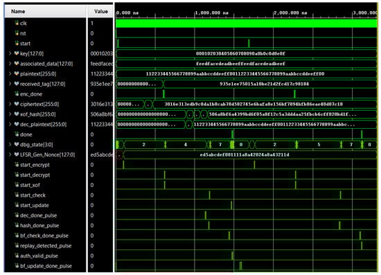 Replay detection performance was evaluated by analyzing the latency of nonce hashing and Bloom Filter verification relative to the decryption path. In the proposed architecture, nonce hashing is accelerated using a 2RPCC permutation core. Rather than executing one permutation round per cycle as in a standard Ascon-XOF128 configuration, the 2RPCC module performs two rounds per cycle using fully combinational logic. This enables the permutations required for nonce hashing to complete in approximately 560 ns. The subsequent Bloom Filter check adds 250 ns. Due to FSM transitions and control logic overhead, the total measured replay detection latency is approximately 820 ns, slightly exceeding the analytical sum.
