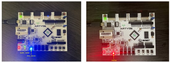 Figure 10 shows the hardware behavior of the Ascon-based IoT authentication system during a replay detection test. This configuration is intended solely for verification and demonstration and does not reflect the operational setup, where detection signals are integrated with high-speed data handling modules. In the first execution (left), a unique nonce is used, the authentication passes, and the auth_valid LED (green) lights up, confirming the message integrity and dec_done LED (blue) to indicate valid decryption. In the second execution (right), the same nonce is reused, triggering replay attack. The replay LED (red) lights up while the auth_valid and dec_done LEDs remain off. This hardware demonstration validates the system’s ability to detect replay attempts and ensure message freshness in real time, an essential feature for secure IoT authentication. These observed LED outcomes correspond directly to the internal FSM states and replay detection signals shown in Figure 9. Specifically, the auth_valid_pulse, dec_done_pulse, and replay_detected_pulse signals are routed to drive the green, blue, and red LEDs, respectively.