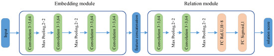 The primary components consist of the embedding module and the relational module. The embedding module comprises four convolutional blocks along with two pooling layers, whereas the relational module consists of two convolutional blocks, two pooling layers, and two fully connected layers with eight and one neurons, respectively. Each convolutional block features a convolutional layer, a Batch Normalization layer, and a ReLU activation function.