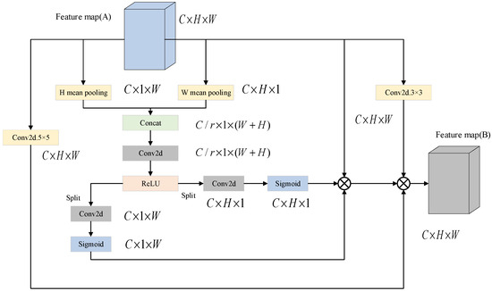 The concatenation of pooled feature maps results in a feature map sized C × (H + W). Following this, the features are combined and processed through nonlinear transformations using convolutional operations alongside ReLU activation functions, which produces a feature map with dimensions C/r × (H + W), where r denotes a scaling factor. Another convolutional operation is then performed, producing a feature map of size C × (H + W). This finalized fused feature map is split into two segments: one measuring C × H × 1 and the other measuring C × 1 × W.