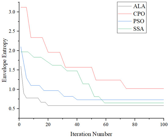 The optimal parameter set for FMD was determined using the ALA, aiming to minimize envelope entropy as the objective function. The outcomes of the optimization are visually examined throughout the process and compared against the results from the Crested Porcupine Optimizer (CPO), Particle Swarm Optimization (PSO), and Sparrow Search Algorithm (SSA). Figure 7 depicts the variation curve of envelope entropy, while Table 3 provides details on the optimal FMD configuration obtained through ALA optimization. The results indicate that the ALA reaches an envelope entropy of 0.58 and stabilizes after 20 iterations. In comparison, the PSO method achieves an envelope entropy of 1.02 after 74 iterations, showing a tendency to become trapped in local optima and demonstrating a slower optimization rate. Although PSO converges quickly in the early phases, it becomes vulnerable to local optima later on due to the convergence of particle velocities. The SSA initially prioritizes exploration, which limits its convergence speed. However, as the optimization process continues, the followers start to actively search, significantly improving convergence speed. Additionally, its capability to resist local optima exceeds that of the PSO method, yet its overall search effectiveness still lags behind that of the ALA method.