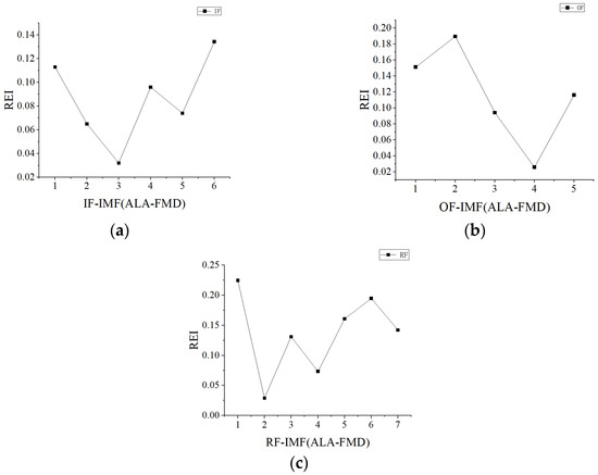 The data corresponding to different fault types were decomposed into signals using FMD, with the minimum REI employed as the selection criterion for optimal modal components. Figure 8 illustrates the REI values of each modal component for various bearing fault types.