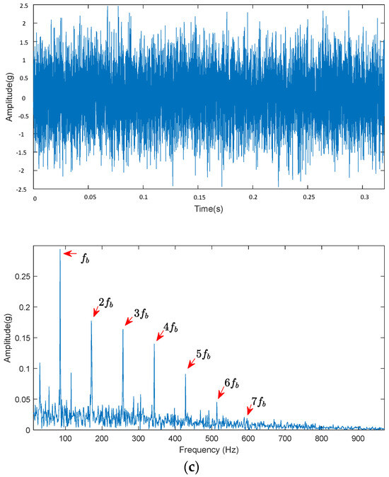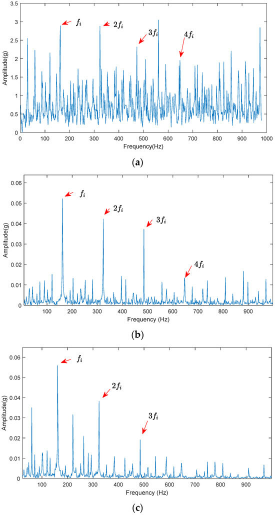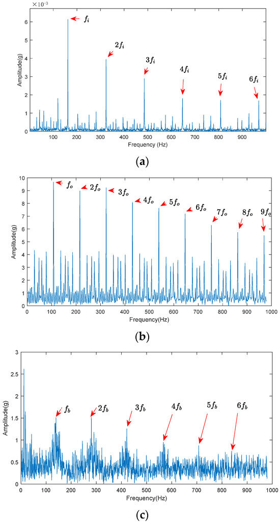 According to the minimum REI selection principle, the third, fourth, and second modal components were selected for the bearing’s inner ring, outer ring, and rolling elements, respectively. The envelope spectra corresponding to the optimal components for various fault types are illustrated in Figure 9. From Figure 9a, the inner ring fault frequency and its sixth harmonic are clearly visible. From Figure 9b, the outer ring fault frequency and its ninth harmonic are distinctly observable. From Figure 9c, the rolling element fault frequency and its sixth harmonic are prominently evident.