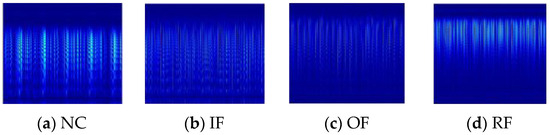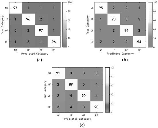 After converting the experimental data into time–frequency diagrams, we first conducted generalization performance tests under various loads. The test set comprised samples from different bearing faults subjected to varying loads, totaling 20 samples. This included five support set samples and 15 query set samples, thereby forming a four-way five-shot task. Similarly, the test set contained samples of different bearing faults under diverse loads, with 100 test samples per fault type (including bearing bearings), leading to a cumulative total of 400 test samples for each test set. Among these, five samples were designated as support set samples, while the remainder were classified as query set samples. The specific distribution is illustrated in Table 10.