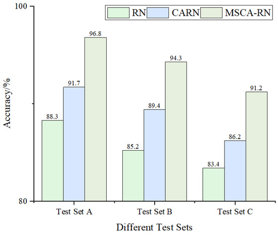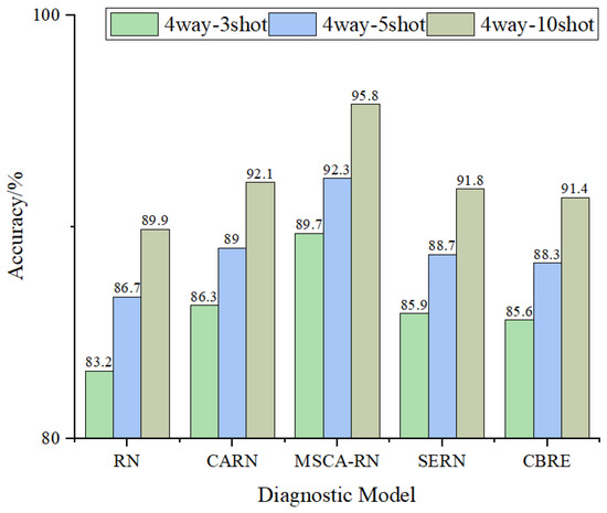 As shown in Figure 18, the performance of each model enhances as the quantity of support set samples rises. The MSCA-RN model consistently achieves higher accuracy than other comparative models across different numbers of support set samples, outperforming the suboptimal model CARN by an average of about 5%, and improving the average accuracy by more than 6.8% compared to other models. This can be attributed to the ALA’s optimization of FMD, which enhances the representativeness of the extracted fault features. Furthermore, the multi-scale coordinate attention mechanism in MSCA-RN facilitates a more effective capture of multi-scale features in time–frequency diagrams, thereby strengthening the model’s fault identification capability.