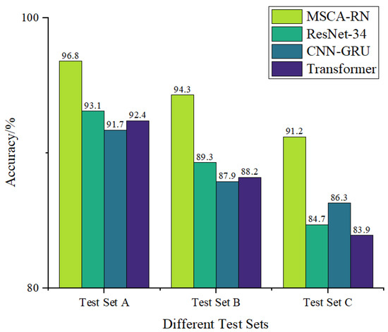 As illustrated in Figure 19, the accuracy of all models improves further with an increase in the total sample size. The MSCA-RN model continues to maintain its leading position, with an average accuracy increase of over 7% compared to the baseline model RN, and an average accuracy increase of over 4.5% compared to other models. While other models show improved accuracy as well, their level of enhancement is comparatively less significant, underscoring the benefits of MSCA-RN in fault diagnosis, particularly when sample sizes are limited.