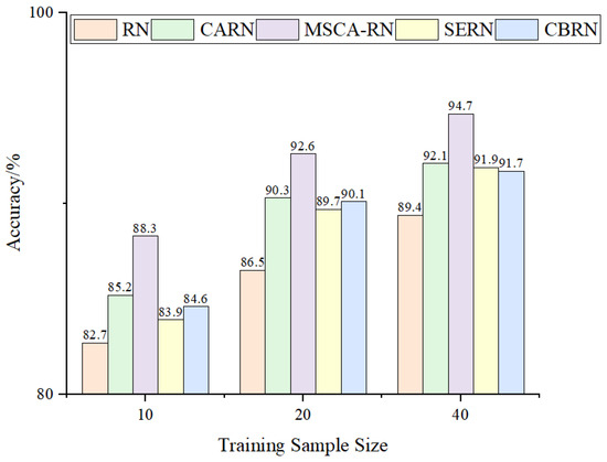To further validate the variation in accuracy with different training sample sizes under the same load, we varied the number of samples during the training phase while maintaining 400 samples in the testing phase. This testing phase included 100 samples each for normal bearings, inner race faults, outer race faults, and rolling element faults. Building upon RN and CARN, this study compares MSCA-RN with both the channel attention-based SENet Relation Network (SERN) and the hybrid attention-based CBAM Relation Network (CBRN).