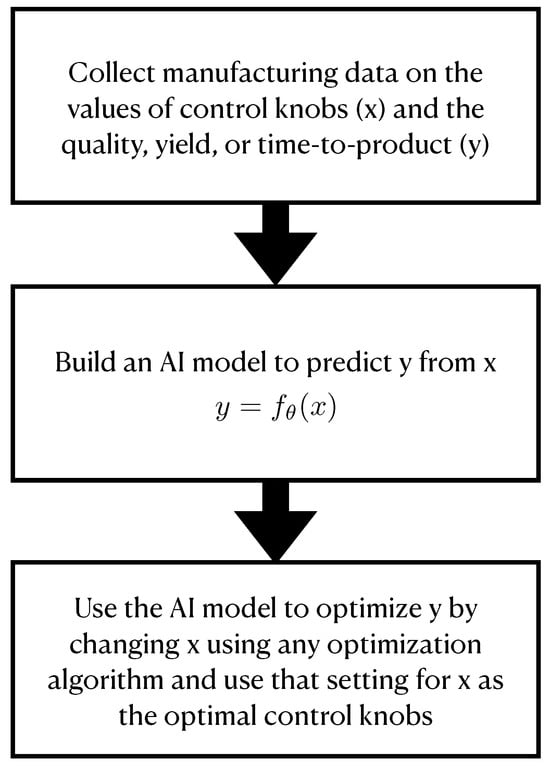 Manufacturing processes are collecting a wealth of data on how operational knobs affect process efficiency and product quality. Yet, optimizing the adjustment of these knobs using artificial intelligence remains a challenge. We propose a simple open-loop control method for optimizing a manufacturing process, with pharmaceutical applications in mind, using artificial intelligence. The first step involves fitting a simple supervised learning model to manufacturing data—typically an artificial neural network with universal approximation guarantees—so that operational knobs (such as concentrations and temperatures) can be used to predict process efficiency (e.g., time-to-product) and/or product quality (e.g., yield or quality score). Assuming the supervised learning model works well, we can perform typical optimization procedures, like gradient ascent, to increase efficiency and product quality. We test this on a publicly available dataset for wine and suggest new values for wine parameters that should produce a higher-quality wine with a greater probability. The result is a setting for the manufacturing knobs that optimizes the product using basic artificial intelligence. This method can be further enhanced by incorporating more advanced and recent AI applications for anomaly and defect detection in manufacturing processes.