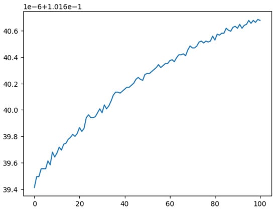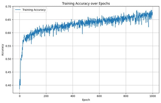 To present a potential use case, we use the publicly available Kaggle dataset of wine properties (fixed acidity, volatile acidity, citric acid, residual sugar, chlorides, free sulfur dioxide, total sulfur dioxide, density, pH, sulphates, and alcohol) that can be controlled by climate, fertilizers, and so on, along with wine quality scores (either 3, 4, 5, 6, 7, 8, or 9). An training/test split was used, leading to roughly 800 data points in the training set. While logistic regression achieved accuracy on the test set and a random forest reached , a simple feedforward ANN—consisting of five dense layers with 64 neurons each, with softmax activations (except for linear activations in the final layer)—achieved accuracy in predicting wine quality on the test set. The ANN used Adam with categorical cross entropy to train. See Figure 3 for an example training curve for accuracy as a function of epochs. Notably, this was not the ANN training curve used to produce the rest of the results given here, as the random initializations were unfortunately not saved from that superior ANN run. Not all datasets in manufacturing will have such low accuracies, e.g., Refs. [14,15].