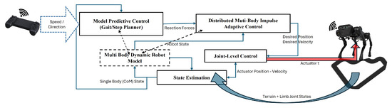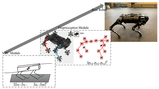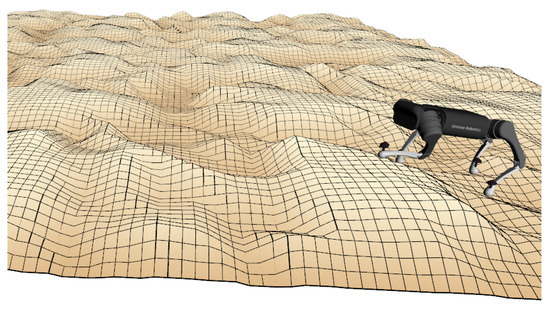 Special autonomous robotics systems (e.g., legged robots) have recently been successfully used in various reconnaissance missions. In 2009, DARPA started a legged squad support system (LS3) project to develop a legged robot that can function autonomously as a pack horse for a squad of soldiers or marines. Under the LS3 project, a series of quadruped robotic systems have been developed in the U.S., including “Spot,” “Mini-Spot” from Boston Dynamics, “Vision 60,” “Spirit 40” from Ghost Robotics, “Cheetah,” “Mini-Cheetah” from MIT, etc. Due to the substantial potential for future search and rescue missions, quadruped robotic development has also attracted international attention. It includes “ANYmal” from ANYbotics in Switzerland, “BEX” from Kawasaki Heavy Industries in Japan, “Go 1” from Unitree Robotics in China, and so on. However, those platforms with their out-of-the-box controllers have limited adaptability for challenging environments such as highly uneven, obstructed, and uncertain terrain [1,2]. Also, all existing quadruped robots suffer from limited agility, primarily due to high computational complexity that is often unaffordable for onboard systems [3,4] and slow mobility caused by inefficient real-time sensing capability [5,6]. Several control strategies have been developed to improve the locomotion of quadruped robots over uncertain terrains. Model predictive control (MPC) has emerged as a promising solution to incorporate constraints and optimization objectives directly in the control formulation [7]. It has been widely applied in quadruped locomotion for its ability to handle multi-variable constraints and anticipate future states based on the given model. Early implementations, such as Di Carlo et al. [8], demonstrated convex MPC formulations on MIT’s Cheetah 3, enabling fast and efficient trajectory planning. These works, however, rely on simplified centroidal dynamics and assume relatively structured environments. Subsequent research [9] proposed Whole body control (WBC) and whole body impulse control (WBIC) [7,10] to improve stability and dynamic consistency across different contact modes. In their implementation, traditional MPC is used to generate the center of mass (CoM) trajectory, whereas WBC focuses on following the generated CoM trajectory by manipulating the actuators and joint positions. This approach presents a viable way, as it provides a dynamically consistent formulation that makes it scalable to more complex systems as well as varied tasks; however, they are not effective in providing enough computations for frequent non-contact phases as required during high-speed running modes. To address this, ref. [11] formulate WBC to follow both reaction forces and CoM trajectories by incorporating pre-computed reaction forces given by MPC as desired reaction forces and relaxing the floating base control. But this strategy is still inefficient when unstructured and uneven terrain operation is considered.