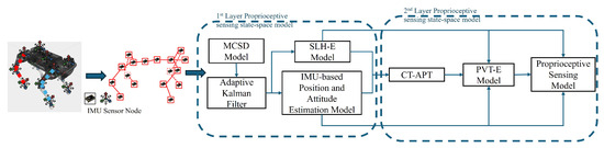 Unlike existing research for state estimation using IMUs, this subsection develops a novel unified two-layer deep mathematical model that thoroughly represents kinetic state space for the quadruped robot. This representation intelligently and seamlessly integrates the four key quadruped robot proprioceptive state estimation components, marking the first time this has been carried out. The structure of the developed quadruped robot kinetic state-space model is shown in Figure 4.