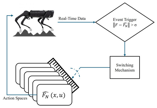 While proprioception is essential for state estimation and precise modeling of legged robots, exteroceptive sensors (IMU) provide crucial information about the robot’s surroundings, facilitating tasks such as navigation, obstacle avoidance, terrain analysis, and object manipulation. This subsection presents the significance of proprioception and exteroception in modeling and control design. Recognizing the high computational cost of processing high-dimensional data in real-time, a low-dimension embedding of the sensory data, as shown in Figure 4, is learned, allowing for more efficient state estimation and environmental dynamics modeling. The low-dimensional data embedding is integrated into the proposed framework for state estimation and joint modeling. Figure 5 shows the process by which the multi-modal architecture is trained. The goal is to train terrain models to comply with the equation , which have different action spaces, and one model is triggered at one point in time. The triggering is completed by a switching mechanism that compares the real-time quadruped robot movement with estimated movement from an individual model that is trained as shown in Figure 6.