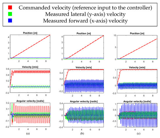Indoors Experiment. (a) Commanded Velocity 0.5 m/s | Gait Trot (b) Commanded Velocity 0.5 m/s | Gait Run (c) Commanded Velocity 1.0 m/s | Gait Pacing.