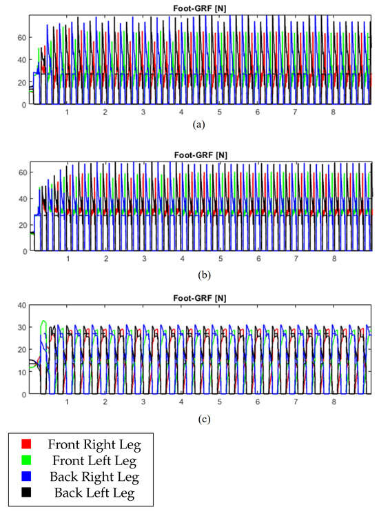 Indoors Experiment Ground Reaction Forces. (a) Commanded Velocity 0.5 m/s | Gait Trot (b) Commanded Velocity 0.5 m/s | Gait Run (c) Commanded Velocity 1.0 m/s | Gait Pacing.