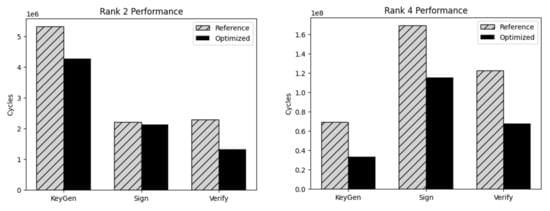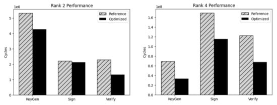 Figure 5 illustrates the cycle counts for key generation, signing, and verification under the ssk configuration. Each group compares the reference and optimized implementations. The results are presented for two representative parameter sets: snova-28-17-16-2-ssk for rank 2 and snova-60-10-16-4-ssk for rank 4.
