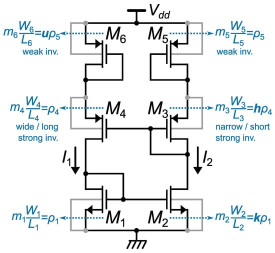 Figure 1 shows a simplified version of the proposed CR, including only the core circuit needed to perform temperature compensation. The complete CR architecture, comprising also auxiliary circuits for LS correction and start-up purposes, is later discussed at the end of this section. The modified BM structure of Figure 1 was first introduced in [26], with transistors and biased in strong inversion and weak inversion, respectively. In addition, in [26], transistor pairs , , and were designed with matched channel widths and lengths, while the ratios between their aspect ratios, , , and , were imposed by acting only on the multiplicity factors (we assume the aspect ratio of each transistor to be defined as , where , , and stand for the multiplicity factor, the channel width, and the channel length of )—regarding the choice of parameters k, h, and u, the existence of a stable dc operating point of the considered circuit is ensured by the following condition: [26].