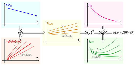 In these relationships, only systematic threshold voltage differences due to geometry-dependent effects are taken into account, while random mismatch errors are not included in the analysis. Referring to (2), it is worth noting that, if , the aforementioned trend is indeed obtained for . Conversely, if and (and/or and ) have unequal threshold voltages, such that is positive and decreasing with temperature, first-order temperature compensation is made possible after optimization of the slope of . To generate the required differences, we propose leveraging geometry dependences of , as explained later. However, prior to presenting more detailed theoretical analyses, a qualitative illustration of the proposed temperature compensation is given in Figure 2. Once transistor pairs - and/or - are sized to achieve positive , the slope of the PTAT term can be adjusted by acting on the k or u ratio between the aspect ratios of matched transistors. By reaching an optimal slope value for the overdrive voltage of , [proportional to ], the temperature behavior of mobility, appearing within the transconductance factor in (2), can be compensated, leading to with first-order temperature compensation.