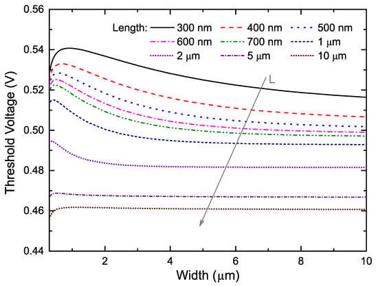 - Kroell, K.E.; Ackermann, G.K. Threshold voltage of narrow channel field effect transistors. Solid-State Electron. 1976, 19, 77–81. [Google Scholar] [CrossRef]