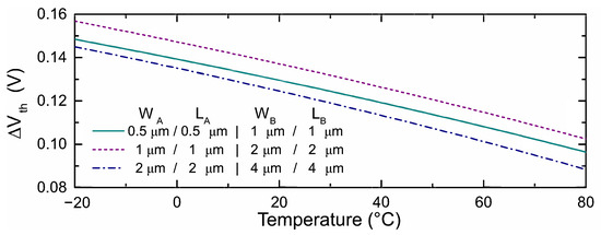 The latter assumption is confirmed by the simulation results of Figure 4: is plotted as a function of temperature in the case where transistor is sized with both W and L twice as large as those of . For different sizing choices of , the temperature trend of the threshold voltage difference remains NTC, with a slope around −0.5 mV/°C.
