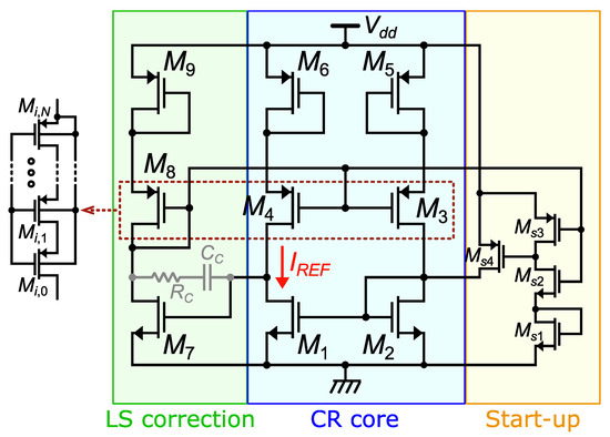 Concerning the LS correction, we adopted a technique inspired by [35,36] and adapted to the proposed architecture. In the basic CR version of Figure 1, the differences between transistors - and - directly follow variations (i.e., ). This may cause relatively large LS due to finite output impedances of the current mirrors. Conversely, in the circuit of Figure 5, the addition of the circuit branch reduces the magnitude of the -to- sensitivity by a factor roughly equal to the intrinsic gain of . Intuitively, it can be noted that, if , a linear proportionality relationship exists between the currents flowing in the two considered branches (i.e., ). Thereafter, if , transistors and result in the same gate-source voltages, forcing . To ensure loop stability, has to take the role previously played by as the input device of the n-type current mirror, while acts as the input device of the p-type current mirror. In addition, to strengthen stability, we applied Miller compensation between the branches and . At start-up, exploiting the pull-up effect from , capacitor also assists in streamlining the turn-on process of the circuit.