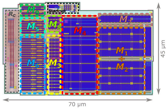For greater simplicity, we chose to exploit geometry dependences only in the transistor pair, while and were sized with equal widths and lengths. The dimension ratios and were chosen based on parametric simulations aimed at TC minimization. For the parameters previously introduced to express ratios between the aspect ratios of different transistors, the following values were selected: , , , and . The passive devices used for frequency compensation, set equal to fF and kΩ, were implemented as a Metal–Insulator–Metal (MIM) capacitor and a high-resistivity polysilicon resistor, respectively.