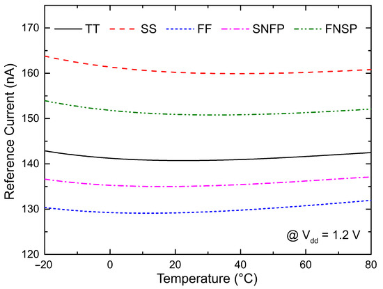 Figure 7 illustrates the temperature behavior of the reference current (defined as the current flowing through in Figure 5). Multiple traces are shown, related to the following process corners: Typical (TT), Slow (SS), Fast (FF), Slow-NMOS–Fast-PMOS (SNFP) and Fast-NMOS–Slow-PMOS (FNSP). In the typical corner, nA is achieved at room temperature, with a total consumption of nA and ppm/°C from −20 °C to 80 °C. Across the other corners, the worst-case TC is equal to 242.2 ppm/°C, obtained in SS conditions.