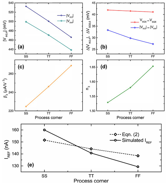 Simulated process corner variations: (a) threshold voltages of and ; (b) and ; (c) transconductance factor of ; (d) subthreshold slope factor of ; (e) reference current.