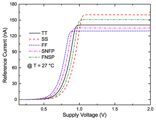 Figure 9 shows the reference current as a function of the supply voltage, again plotted for various process corners. Based on such results, the minimum supply voltage is assumed to be equal to V. For , the LS is equal to −0.0251%/V in the typical corner, while a worst-case value of 0.171%/V is obtained in the FF corner.