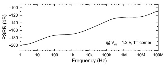 In Figure 11, the Power-Supply Rejection Ratio (PSRR) is shown as a function of frequency. This quantity is herein defined as the rejection ratio of variations towards , assuming the dimension of a conductance. It is equal to −199.3 dB at 1 Hz, −170.2 dB at 1 kHz, and −125.2 dB at 1 MHz.