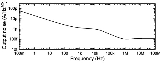 The noise current spectrum is illustrated in Figure 12, evaluated at the drain terminal of . At room temperature, the broad-band noise floor and the flicker corner frequency are equal to 1.1 and 410 Hz, respectively. The integrated noise is equal to 43.31 pARMS from 0.1 Hz to 10 Hz and 1.22 nARMS from 0.1 Hz to 100 MHz.
