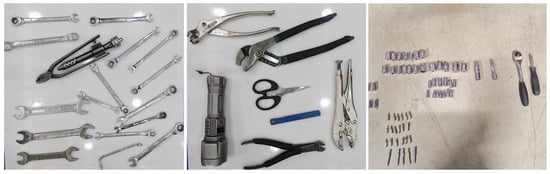 To address these limitations, our proposed framework integrates multiple components to ensure end-to-end intelligent tool management. First, to enhance robustness across variable tool types and scales, a self-attention mechanism (SAM) is employed for multi-scale feature fusion. Second, knowledge distillation [4,5,6] and pruning [7,8,9,10,11,12,13] are adopted to compress models, enabling efficient inference on resource-constrained edge devices without compromising accuracy. Third, to support semantic-level interaction, generative large language models (LLMs), such as those based on retrieval-augmented generation (RAG), are used to transform user queries into executable SQL statements and retrieve structured results from the database. These modules collectively operate through an agent-based mechanism that bridges low-level perception and high-level decision-making. This unified architecture forms a practical and scalable pipeline from real-time edge-side detection to intelligent data-driven management, particularly suited for tool tracking and safety supervision in high-end equipment manufacturing. Figure 1 presents sample images from the aircraft boarding tool (ABT) dataset used in our detection tasks.