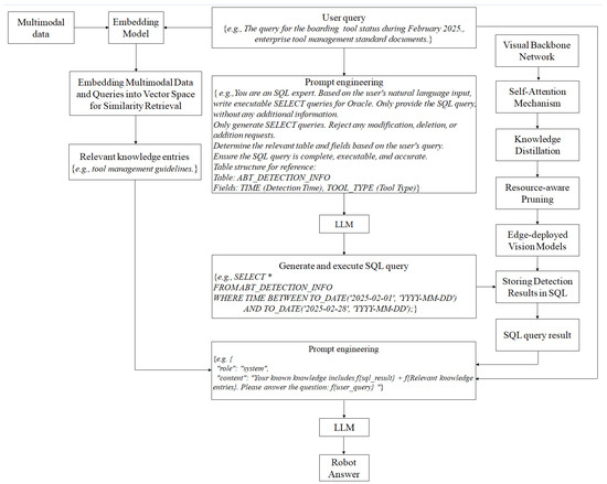 The detection results for boarding tools need to be organized and summarized for submission to the management, which presents a significant challenge for extracting target information from complex datasets. To support intelligent interaction and data-driven decision-making, our framework incorporates large language models (LLMs) at multiple stages. Specifically, we utilize the Qwen2.5-32B pre-trained model to generate executable SQL queries based on natural language prompts. This component enables the transformation of user intent into structured queries, allowing seamless access to detection results stored in relational databases. Qwen2.5 was selected for its strong performance in instruction-following and structured data comprehension tasks, which aligns with the requirements of industrial tool management systems. Furthermore, we employ the DeepSeek-32B pre-trained model in the final reasoning stage. This module is responsible for synthesizing the user query, detection results, and relevant knowledge entries retrieved from multiple sources (including structured databases and document corpora). It supports complex question answering and knowledge grounding, making it wellsuited for providing domain-specific intelligent recommendations in high-end manufacturing scenarios. Both models are based on publicly available pre-trained weights and are integrated via an agent-based mechanism. This modular design allows the system to interpret user queries, generate SQL, retrieve data, and synthesize responses in a stepwise and semantically consistent manner.
