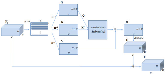 We designed a self-attention mechanism, as illustrated in Figure 3. Specifically, the input feature has a size of . It is reshaped along the spatial dimensions H × W into H × W feature vectors of size 1 × C, denoted as I. Each vector represents the feature characteristics at a specific spatial location. Subsequently, these vectors are transformed using learnable weight matrices , , and to generate the corresponding Query (Q), Key (K), and Value (V) representations, which are computed as follows: