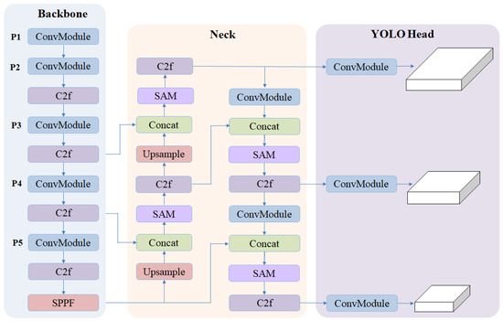 An illustration of the integration of the self-attention mechanism (SAM) in the Neck section of the network. The module is applied after the concatenation of multi-scale features, enhancing spatial correlation and improving feature extraction. This design enables the network to capture fine-grained details, leading to better robustness and adaptability in complex environments.