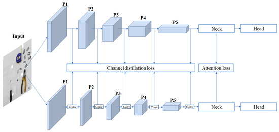 In the engineering application of deep neural network models, there are often high demands for computational real-time performance, resource efficiency, and detection accuracy. To deploy the detection model under limited computational resources while ensuring detection precision, we adopted knowledge distillation as the initial step in model lightweighting. We designed feature attention distillation and channel distillation loss for model training, leveraging a pre-trained teacher network to guide the knowledge distillation process. The distillation workflow is shown in Figure 5.