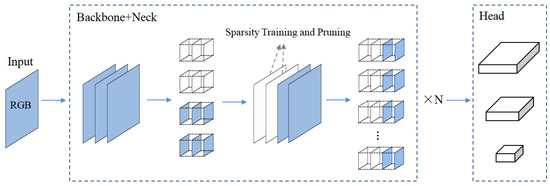 To further meet the lightweight and efficient detection requirements of industrial scenarios, we proposed a novel regularization technique, Dynamic Sparsity Regularization (DSR), which is designed to compress the model and adapt it to industrial needs. Building on the trained student network, DSR dynamically selects the least activated channels based on their L1 norms and applies L2 penalization to enhance feature sparsity. The sparsified channels are then pruned, as shown in Figure 6. This process results in a model that is more compact and efficient, while still retaining the required performance for practical applications.