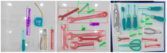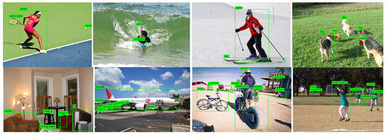 Experiments were conducted on two datasets, i.e., the COCO dataset [44] and the aircraft boarding tool dataset, to evaluate the performance of the proposed methods. The COCO 2017 dataset (Common Objects in Context) is a large-scale open-source computer vision dataset. It consists of over 200,000 labeled images with over 80 category labels. COCO 2017 is known for its complex real-world scenes, high-quality annotations, and support for multiple vision tasks, making it a key benchmark for evaluating deep learning models. The COCO dataset, used for both training and evaluation, contains approximately 118,000 training images, 5000 validation images, and 20,000 test images, with detailed annotations for object detection tasks. Some representative sample images from the dataset are shown in Figure 8. To enhance the management of aircraft boarding tools, we constructed the ABT dataset, which includes 22 types of specialized tools used in various professional boarding operations. The ABT dataset consists of 1232 images, collected from real-world scenarios featuring specialized tools used for aircraft maintenance and servicing. The data collection process was conducted using industrial cameras, which were installed in designated tool operation recording areas. The camera angles and positions were fixed to maintain consistency, and lighting compensation devices were deployed to ensure stable and adequate illumination. This setup guarantees high-quality image capture, providing a reliable dataset for research and management of aircraft boarding tools. Regarding training details, the YOLOv8 training process employs an initial learning rate of 0.01 with a final decay factor of 0.01. It supports multiple optimizers, including SGD and Adam, with the momentum set to 0.937 and a weight decay of 0.0005. A warmup strategy is applied for 3 epochs to stabilize training, using a warmup momentum of 0.8. Early stopping is enabled with a patience of 100 epochs, ensuring efficient and stable convergence. The experiments were implemented using the PyTorch v2.3.0 framework. For performance evaluation, we report accuracy and resource cost metrics. The hardware utilized included an Intel (R) Xeon (R) Silver 4110 CPU at 2.10 GHz with 64 GB of memory, and the GPU was the NVIDIA GeForce RTX 3090. In addition, deployment on edge devices was tested using the NVIDIA Jetson Xavier NX to verify the framework’s applicability under resource-constrained conditions.