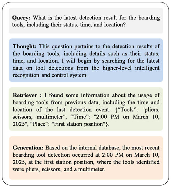 The intelligent question-answering system based on the proposed RAG large language model can extract detailed data from the tool detection system in real time, including time, location, and relevant tool information. By efficiently integrating these data, the system provides management with fast and accurate judgment criteria and decision support, as shown in Figure 10. The in-depth analysis and processing of these data enable managers to monitor and identify potential risks associated with boarding tools in realtime, allowing them to take timely preventive measures. This intelligent system not only significantly enhances the efficiency of safety management but also reduces the occurrence of excess tools on board, effectively ensuring the safe operation of the work environment.