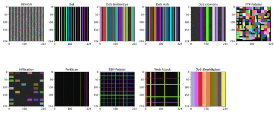 Through the aforementioned approach, the original traffic data are effectively transformed into corresponding visual representations. Figure 3 illustrates typical image samples of various attack types extracted from the CICIDS-2018 dataset. By analyzing the detailed visual features in these images, the MobileNetV3 model can more accurately identify and differentiate different types of network attacks, playing a crucial role in practical security defenses.