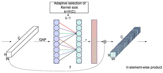 The original MobileNetV3-Small utilized an SE [23] attention mechanism. Despite the numerous improvements that have been made to the model [24,25,26,27], such as enhancing its accuracy by capturing more complex channel dependencies or integrating spatial attention, these alterations often increase the model’s complexity and computational load. The Efficient Channel Attention Network (ECA-Net) [28] replaces the MLP module with a one-dimensional convolution (kernel size k), which avoids channel dimensionality reduction while significantly reducing computational costs. This addresses the limitations of SE blocks, ensuring a direct correspondence between channels and their weights, and effectively enabling cross-channel interaction [29,30]. The model diagram is shown in Figure 5.
