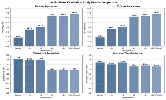 As shown in Figure 8, IM-MobileNetV3 has the highest number of correct classifications and the lowest number of incorrect classifications. Moreover, both the TP and TN rates are higher than those of MobileNetV3-Small by more than 100 cases, clearly demonstrating its superior classification performance. To further quantify this comparison, the key classification metrics (accuracy, precision, recall, F1 score) for each model were summarized and visualized, as illustrated in Figure 9.