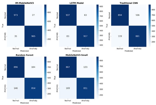 In order to provide a more intuitive understanding of the performance of IM-MobileNetV3, MobileNetV3-Small, CNN, LSTM, and random forest in anomaly detection, Figure 8 shows the classification confusion matrix of these five models on CIC-IDS2018.