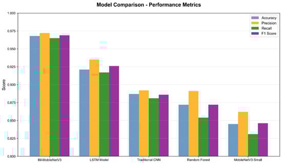 As shown in Figure 9, IM-MobileNetV3 achieved the best results across all evaluation metrics (accuracy: 0.969, precision: 0.973, recall: 0.965, and F1 score: 0.969), significantly outperforming other models. The LSTM model followed closely, with all metrics exceeding 0.9. The CNN and random forest models performed similarly, with metrics above 0.85. The MobileNetV3-Small model had the weakest performance, highlighting the compatibility issues that arise when directly applying the original model structure to traffic detection tasks.