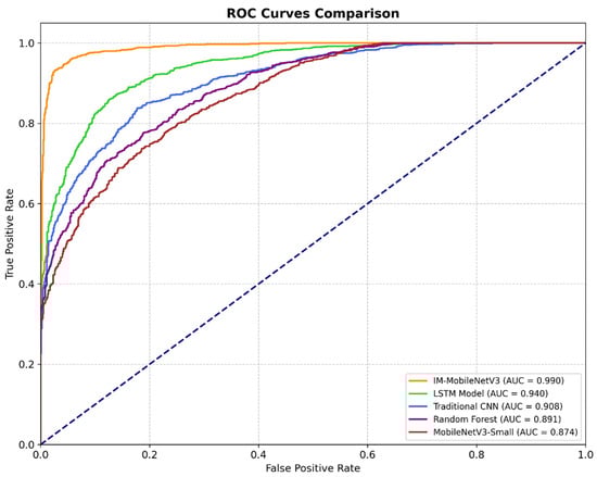 The ROC curve and AUC value are crucial metrics for evaluating the performance of supervised learning in classification tasks. In the ROC space, a higher false-positive rate (FRP) and a true-positive rate (TPR) closer to 1 indicate better classification performance. The point (0,1) represents the ideal classification with the highest performance. As shown in Figure 10, the ROC curve of the IM-MobileNetV3 model is closest to the top-left corner, with an AUC value of 0.990, significantly outperforming other models. The LSTM and CNN models have AUC values of 0.940 and 0.908, respectively, followed by the random forest model, which has an AUC value of 0.891, also close to 0.9. Lastly, the MobileNetV3-Small model has an AUC value of 0.874. This indicates that IM-MobileNetV3 excels in distinguishing between normal and abnormal traffic.